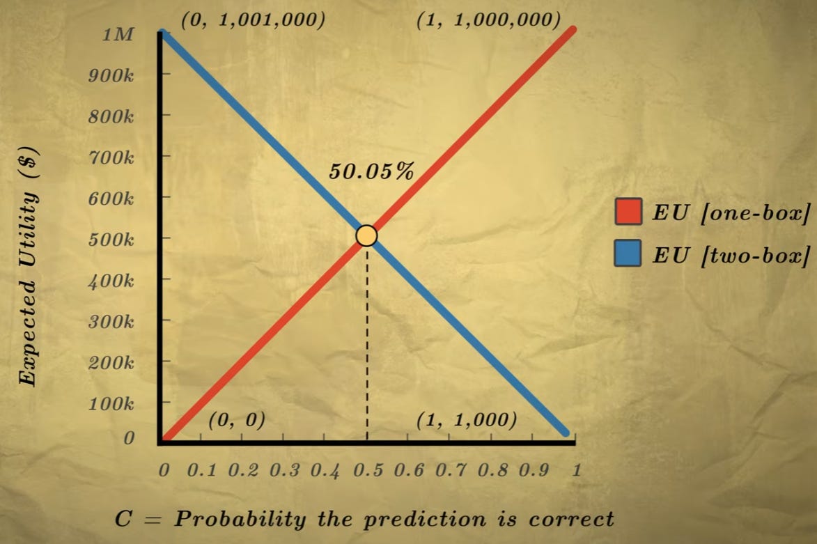 Simplify this to just million dollars times c if I equate these two expressions, I’m going to get the c at which these two expected utilities are equal. And it turns out that the c at which this happens is 0.5005 or 50.05%, which means if the computer is better at predicting than what is basically random, then the expected utility of one-box is going to be higher. [03:32-04:53]