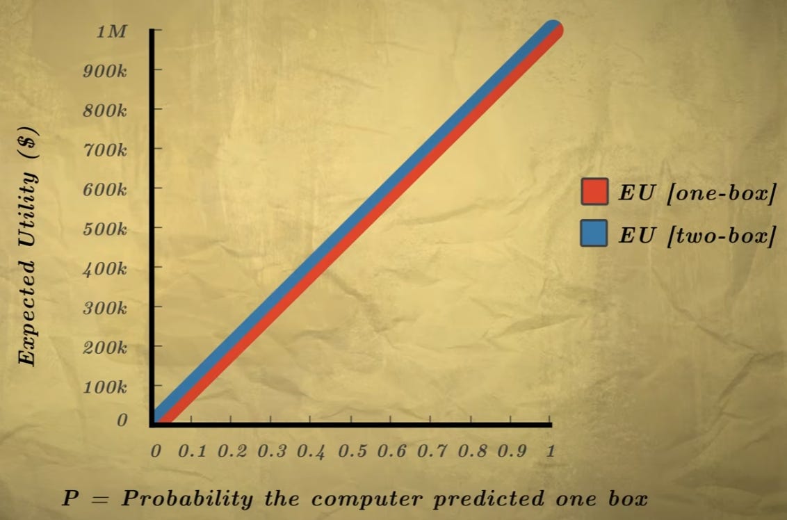Since 1001000p is strictly greater than 1000000p for any probability p, the expected utility of two-boxing is strictly greater than the expected utility of one-boxing, and so we should one-box. Here, they show the expected utility as a function of p: